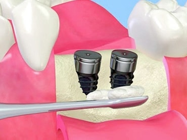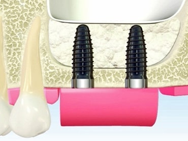 インプラントを骨に埋めた後、インプラントが露出した所に人工骨を置いて膜を被せて数ヵ月後には天然骨になる治療法です。